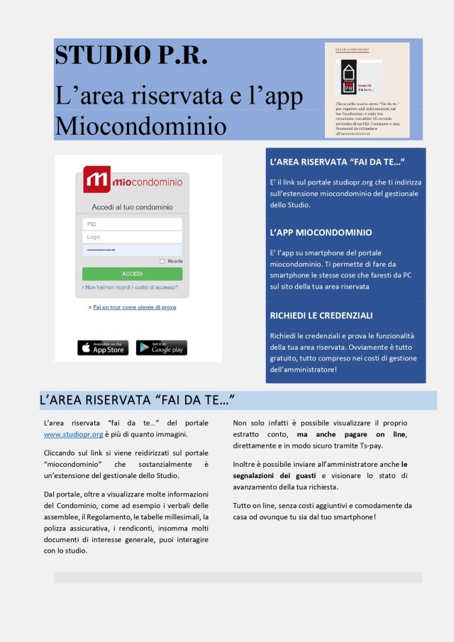 L’area “fai da te…” è stata rinnovata! Ora puoi non solo consultare la documentazione del tuo Condominio ma puoi anche interagire con lo studio, come ad esempio inviare le segnalazione dei guasti e pagare direttamente on line!